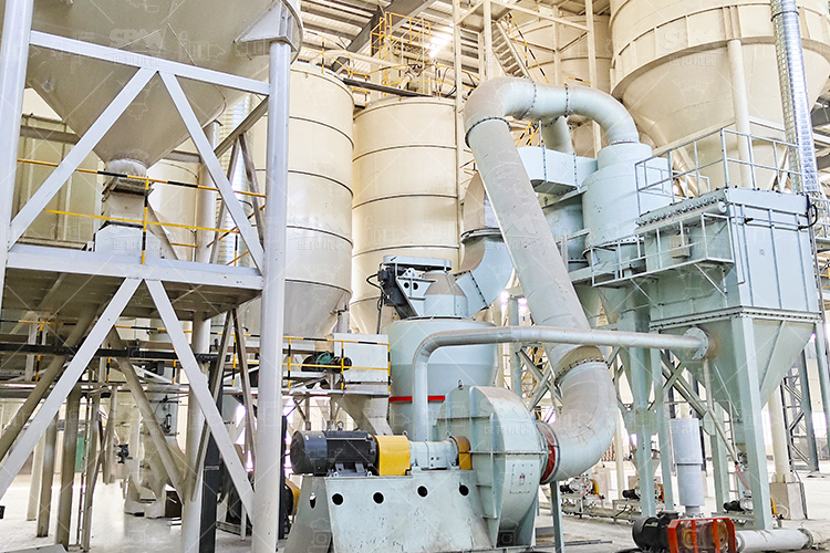 原料經變頻皮帶給料機均勻定量連續地送入主機磨室內進行研磨。粉磨后的物料被風機氣流送入選粉機進行分級,在分析機的作用下,不符合細度要求的物料落入磨室內重新碾磨,合格的物料則隨氣流經管道進入旋風集粉器內,進行分離收集,經排料裝置排出即為成品粉體。分離后的氣流通過旋風集粉器上端回風管進入風機。該生產系統在負壓密閉條件下運行,并配有脈沖除塵器無粉塵外溢,符合國家環保標準。