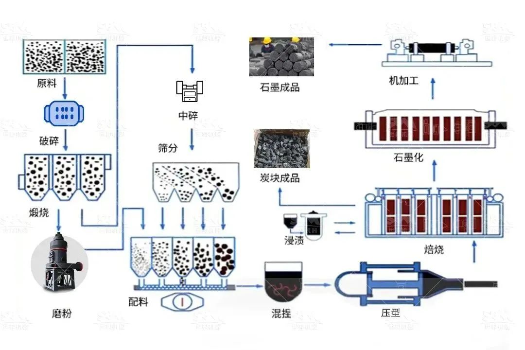 碳素生產(chǎn)流程:以石油焦、針狀焦為原料,煤瀝青為黏結劑。經(jīng)過原料煅燒、破碎磨粉、配料、混捏、成型為生坯,焙燒固化得到炭塊。